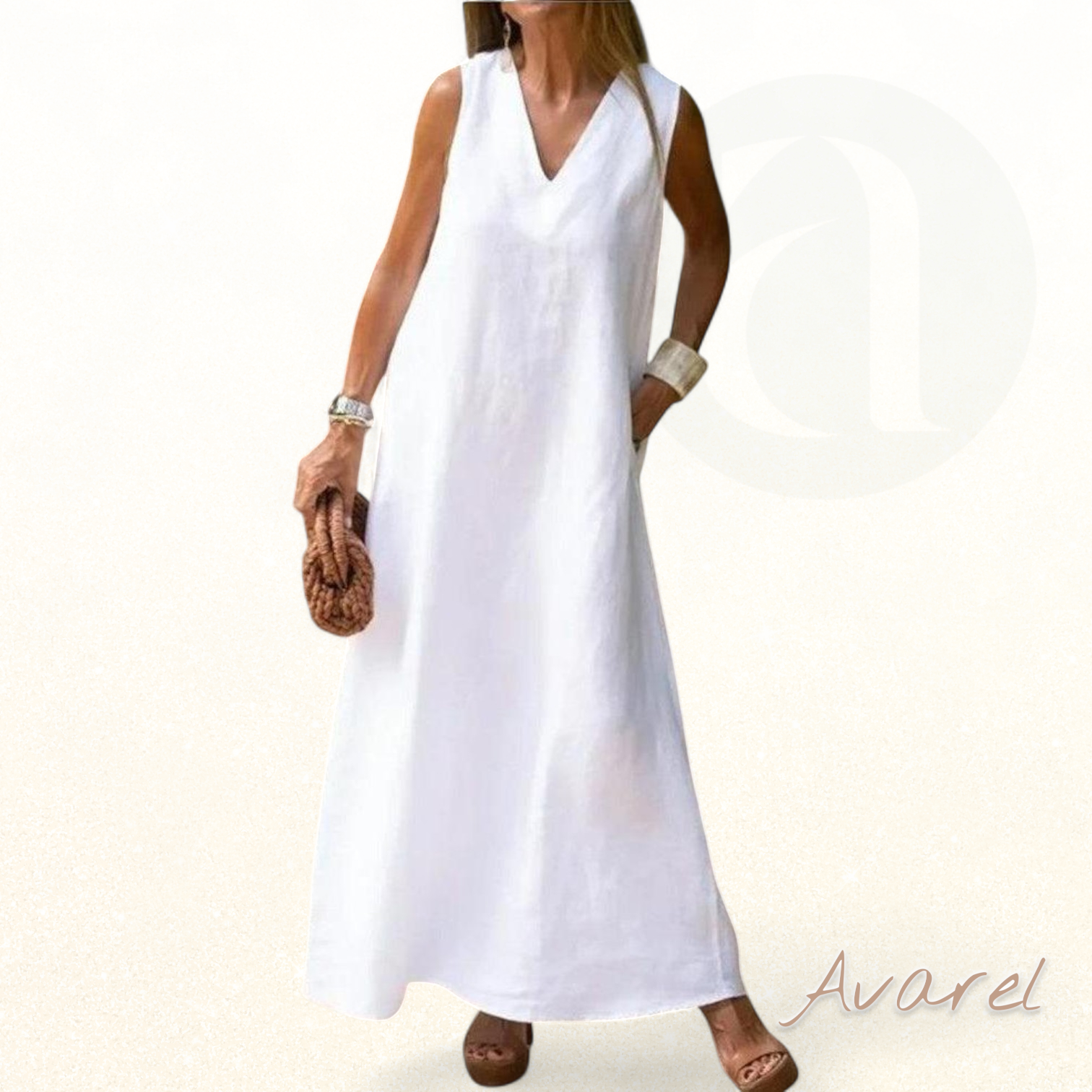 Elegantes bohemisches weißes Baumwollkleid mit V-Ausschnitt und A-Linien-Saum Ă€rmellos fĂŒr einen anspruchsvollen Stil