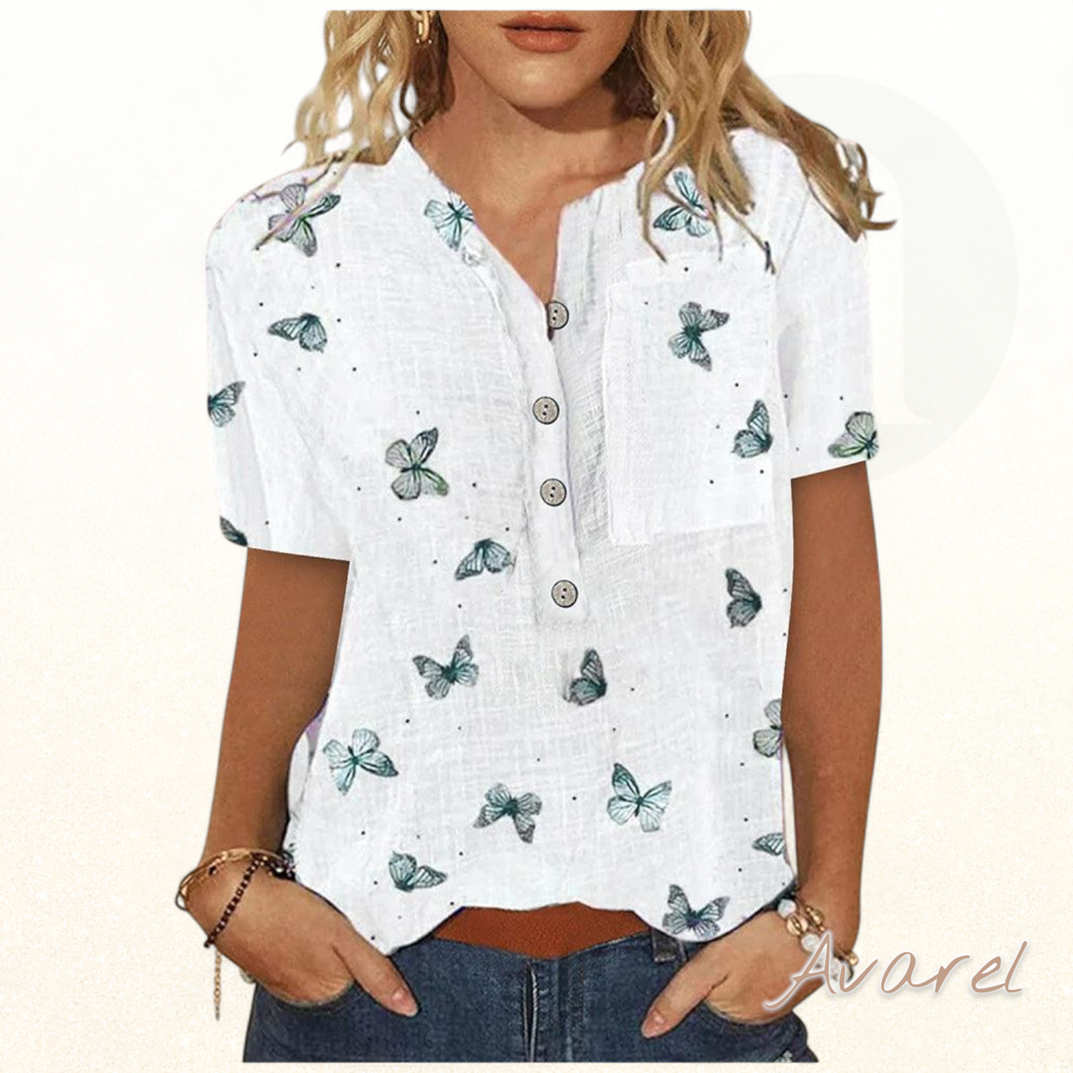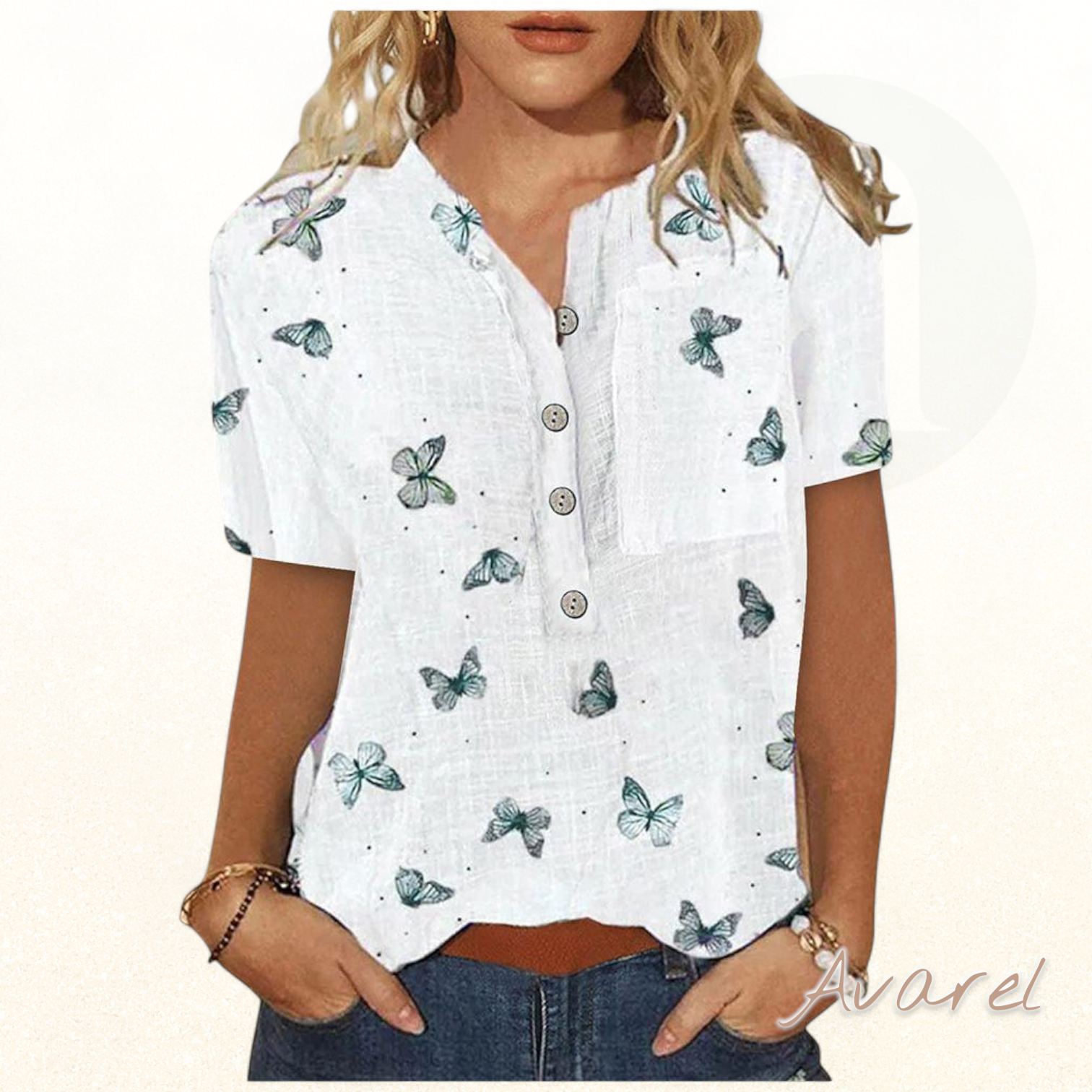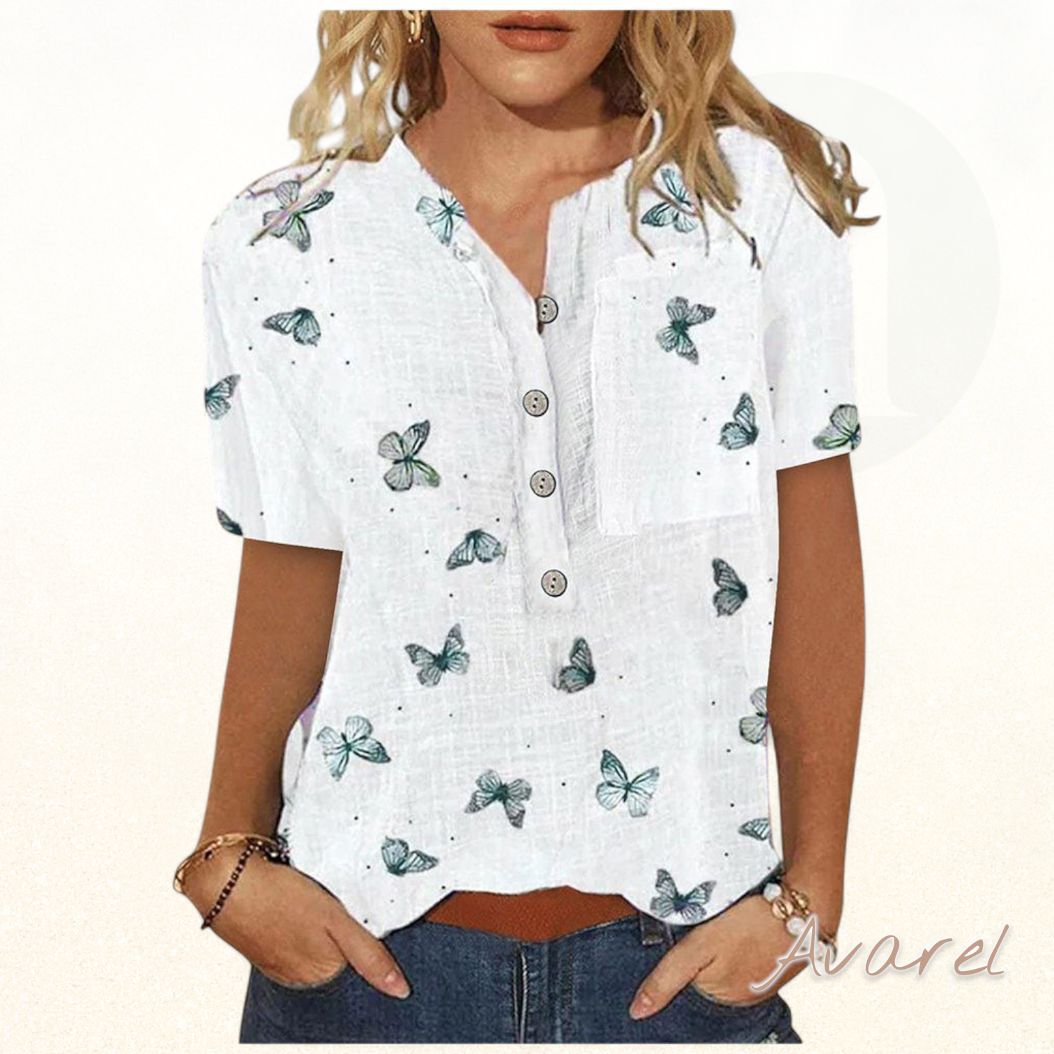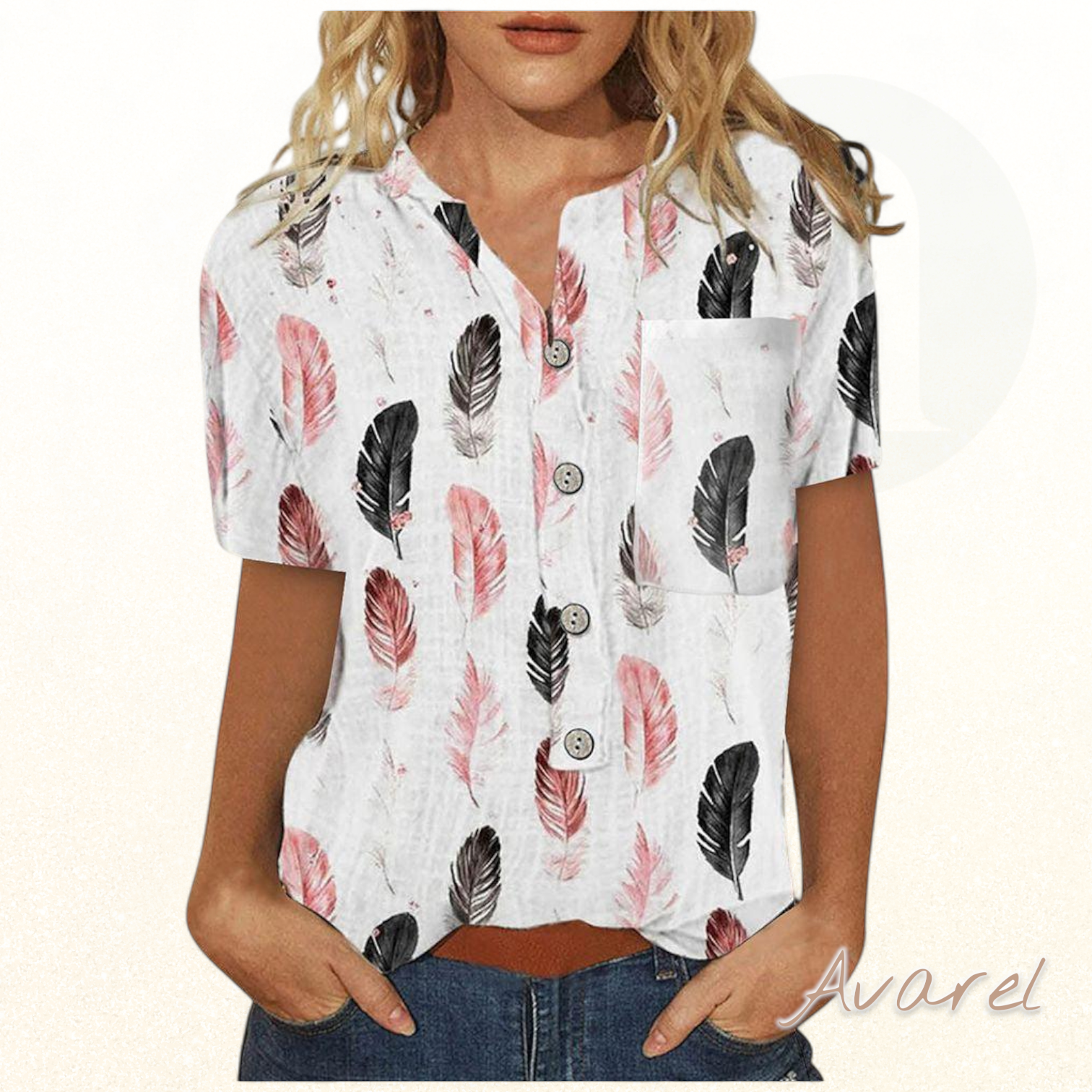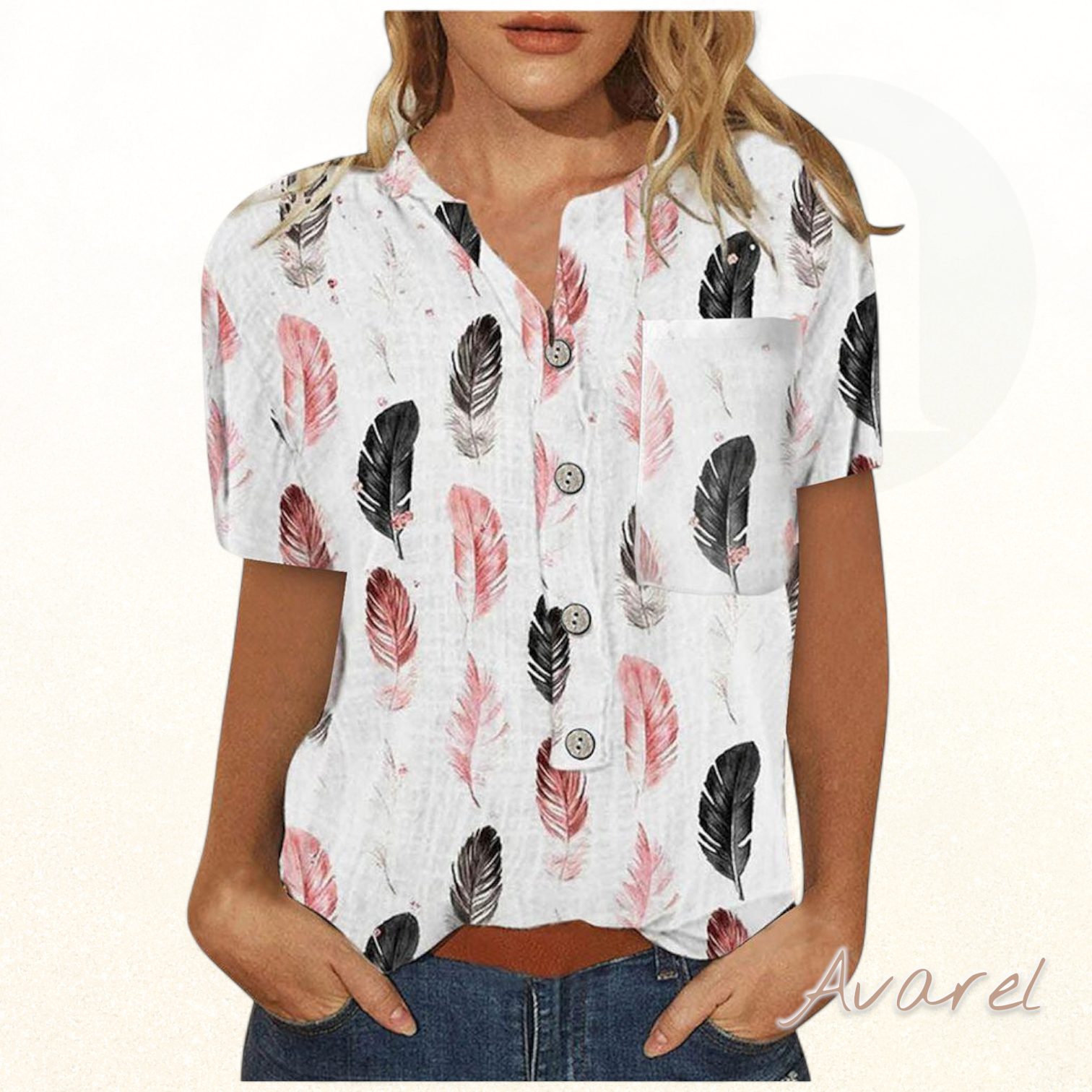 🌸 Vielseitigs Design: S’lässige Muster mit Fäderdruck, dä V-Ausschnitt und funktionelli Details wie Täschli und Knöpf mache dis Outfit flexibel und modern.